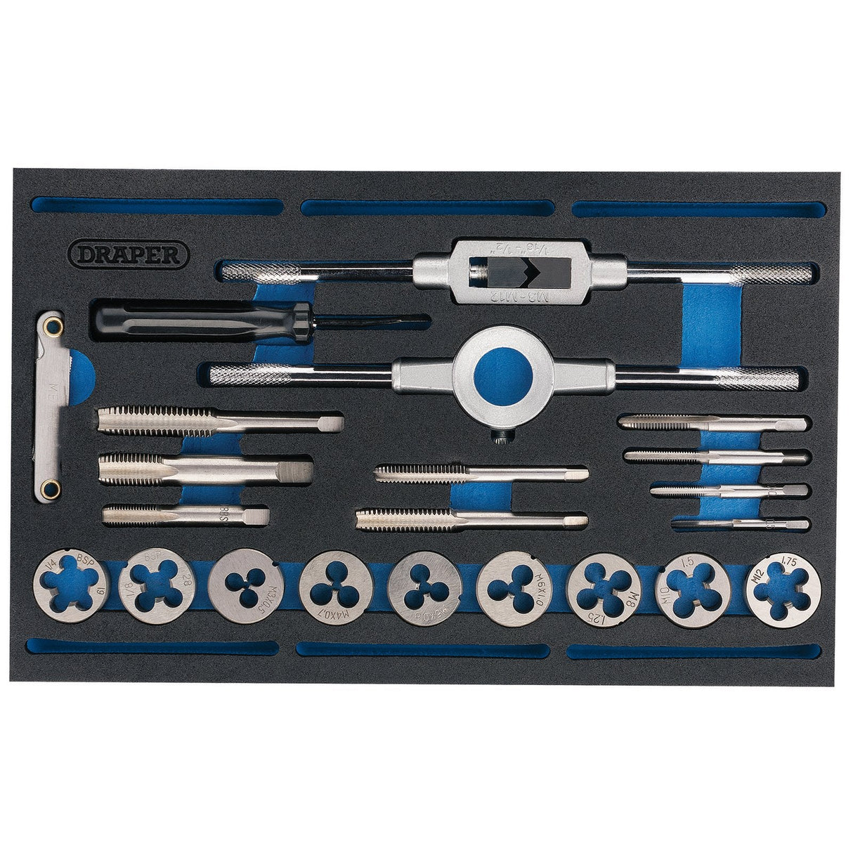 Expert Quality, manufactured from carbon steel. Taps and dies suitable for cleaning and cutting threads on mild steel and aluminium. Supplied complete in a two tone 1/4 drawer EVA insert tray made from closed cell foam, suitable to be used in Draper and Draper Expert tool chests and other manufacturers similar tool chests.