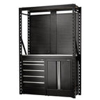 Our modular storage combo includes 2-tier racking with options for hardwood or stainless steel shelving, pegboards, and floor cabinets, enabling a true transformation of your space.