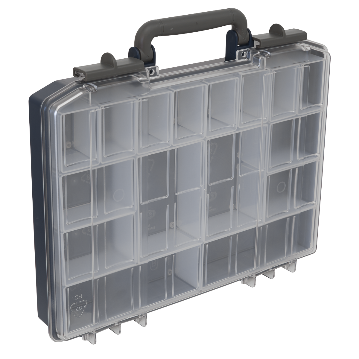 Professional lightweight assortment case made of impact resistant polycarbonate and polypropylene for durability and strength with robust hinges. Supplied with 16 assorted cups ideal for storing a mixture of small, medium and large fixings, fuses and components. U-profiles on the underside of the lid keep the contents in place during transportation even with compartments missing. Removable compartments enable the user to mix and match the assortment case to their needs. Clear lid for easy identification of contents. Twin sliding locks with the option of adding two padlocks for extra security.