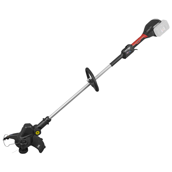 Designed for the professional, offering heavy-duty, high performance, durable tools with lightweight composite designs for superior control and comfort. Operates using 2 x 20V batteries from the Sealey SV20 Series (batteries must be of the same Ah rating) Wide cutting width of 30cm. Bump feed line. 2-in-1 function fitted with wheels for grass trimming and edging. 90° rotating head allows for a comfortable cutting angle.