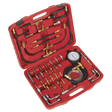 Comprehensive kit of hoses, adaptors and fittings for testing the pressure on modern petrol fuel injection systems. Fitted with quick couplings and safety valve to prevent inadvertent discharge of fuel under pressure. Supplied with Ø92mm single high pressure gauge with rubber bumper, reading 0-140psi and 0-10bar. Pressure release valve fitted with long drain hose allows safe recovery of fuel. Supplied in storage case.
