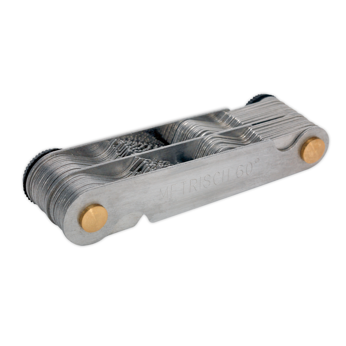 Folding 52 blade set, individually stamped with accurate thread profiles. Range 4-62 BSW and 0.25-6mm Metric.