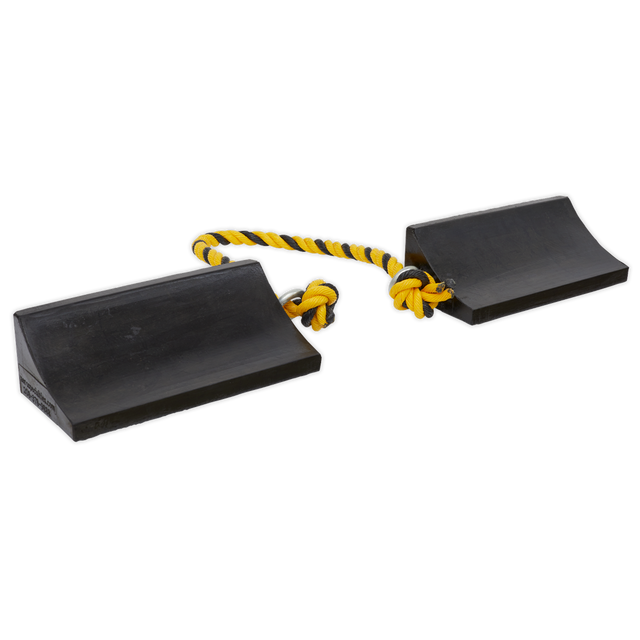 Durable 2.1kg rubber wheel chocks (1.05kg each). Prevents car, caravan or light aircraft moving when jacking or parked on an incline. Supplied on sturdy 550mm rope for easy storage and removal from underneath wheels. Not intended for use on sloped ground over 10°.