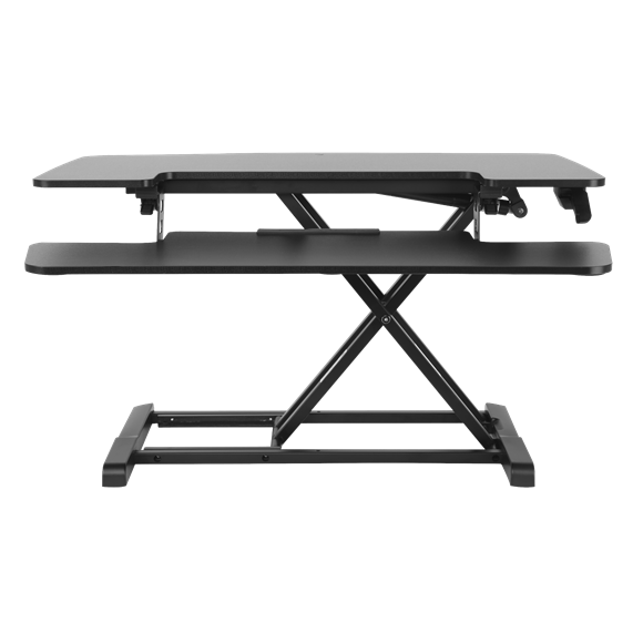 Height-adjustable desk riser creates the possibility of a sitting or standing working environment. Spacious 35" work surface enables you to keep all your essential office items in one space. Features sizeable keyboard tray which is easily removable when not in use. Desk riser is vertically adjustable ensuring you stay within the footprint of your desktop. Smooth, pneumatic lift functionality powered by a high quality gas strut. Converts any desk into a standing desk.
