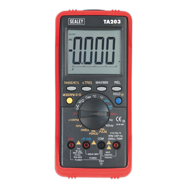 Extra-large, high-contrast LCD display with 36mm high digital read-out, bar graph and back light. Durable case with probe storage and integral stand, suitable for the toughest workshop conditions. Features millisecond pulse-width function for accurate measurement of fuel injection systems. Includes auto-ranging, data-hold and auto-power-off. Bar-graph is essential for the correct testing of lambda sensors. Supplied with inductive coupler (IC) with adjustable sensitivity, for fast reading of engine rpm, test leads (probe and clip) and thermocouple plus USB interface cable and Windows ME/XP/Vista software for downloading data to PC.