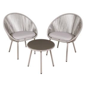 Frame constructed from powder coated steel. Contemporary design with Ø8mm round weather-resistant Textilene® rope. Powder coated steel table with 5mm shatterproof tempered glass top. Supplied with 5cm thick seat cushions. Set includes two chairs and tempered glass top table. Some simple assembly is required.