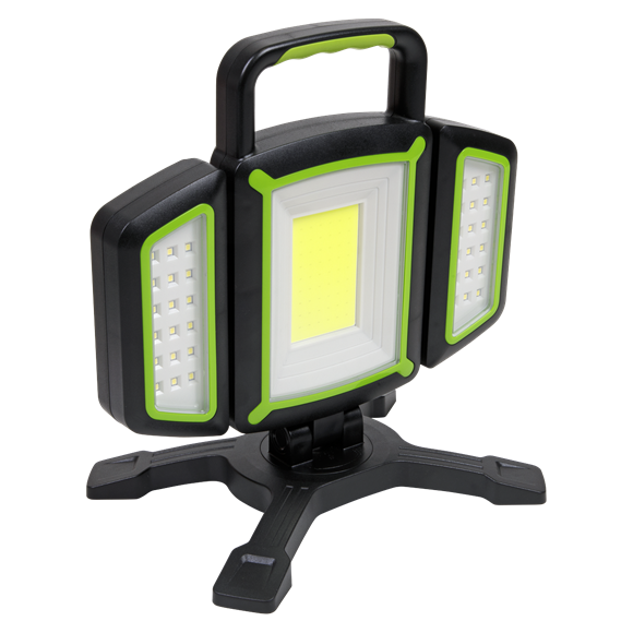 Rechargeable Flexible Floodlight with adjustable light angle with three light sources. Front 18W COB LED producing 1500 lumens. Two adjustable 9W SMD LED side lights producing 600 lumens each. Five light modes with maximum run time of 9hr. Light can be rotated 360°, whilst the side lights can rotate 180° independently to light even larger area. Long beam distance of 20m to illuminate a larger area. Other features include four freestanding magnetic feet, large carry handle, emergency power bank function and supplied with screw adaptor to fit SEALEY Tripod TRI01. Battery type: 3.7V 4.4Ah Li-ion. Type-C charging port and 80cm USB cable included.