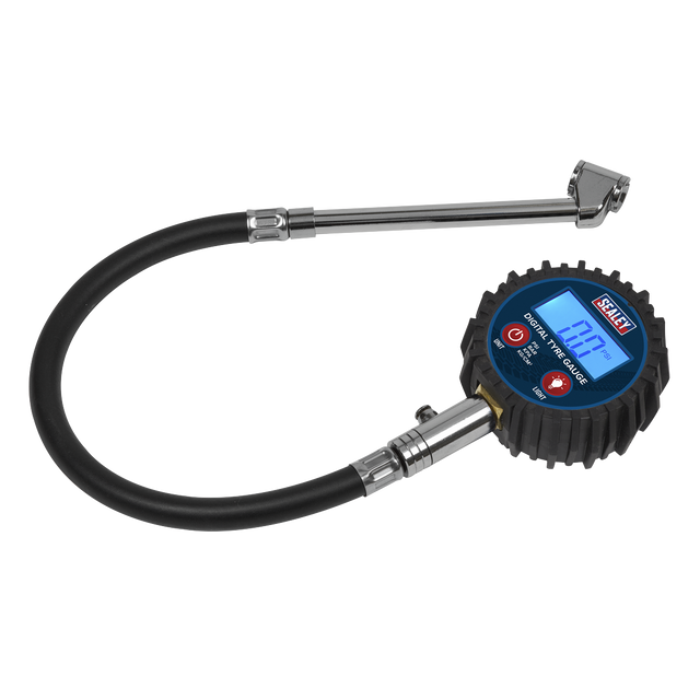 Die-cast body and digital type gauge with rubber protector. Displayed in psi, bar, kPa and kg/cm². Supplied with hose and twin push-on connector. Pressure release valve. Auto-power-off function.