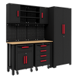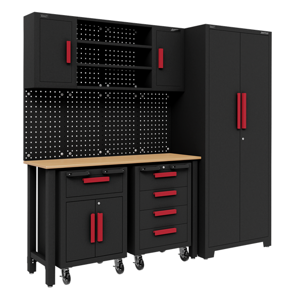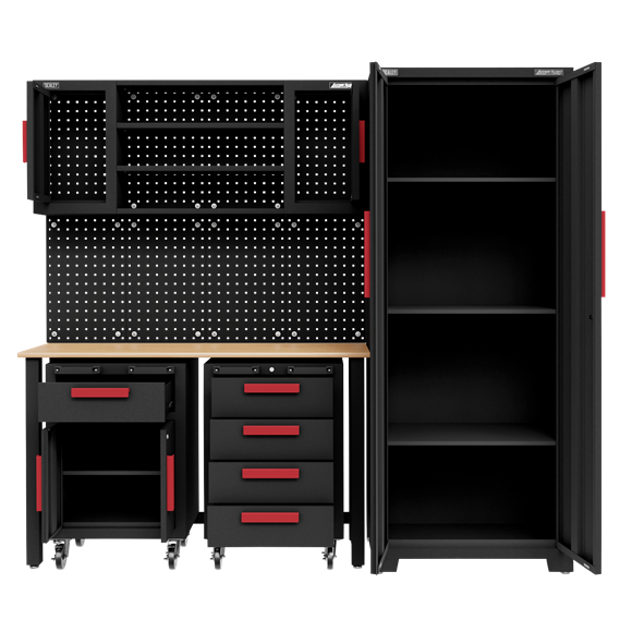 Complete your garage or workshop with this stylish complete garage storage solution. All units are powder coated to protect against scratches, mild solvents and general workshop use. Fully welded units offer a strong and professional finish conveniently packed and delivered in one tidy pallet. Pegboard design wall panels allow for additional storage whilst protecting the wall behind the workbench. Some simple assembly is required.