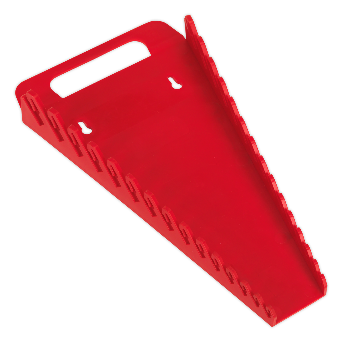 Soft, non-marking TPR material spanner rack helps maintain an organised toolbox or workstation. Securely holds up to 15 spanners for easy size identification. Can also be carried or hung on a wall. Solvent and fuel resistant.