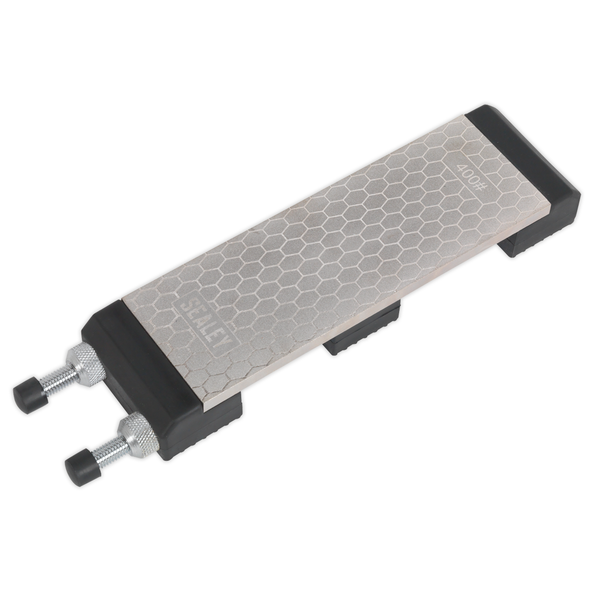Diamond whetstone, for quick and easy sharpening of knives, chisels, scissors, cutting blades and other edged implements. Combination of 400 and 1000Grit surfaces. Whetstone will sharpen carbon steel, high-speed steel (HSS) and tungsten carbide. Can be used wet (with water as a lubricant) or dry. Supplied with an adjustable robust non-slip holder which can be used with stones from 135mm to 215mm in length.