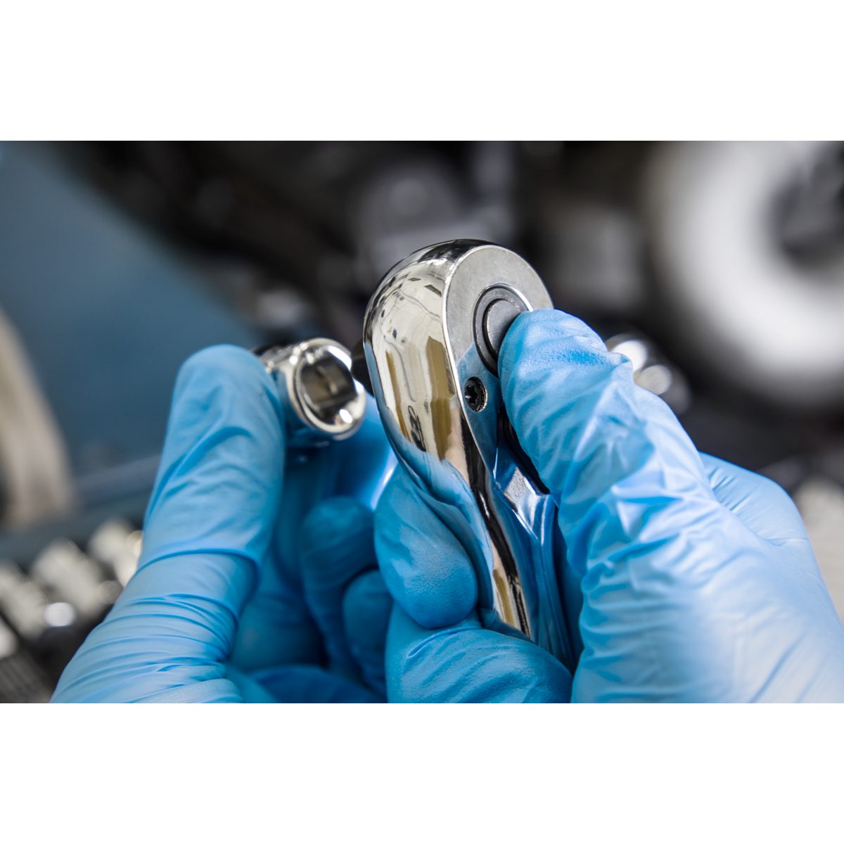 Chrome Vanadium steel 72-tooth ratchet wrench set, hardened and tempered, with a fully polished mirror finish. Features pear-head with flip reverse, push-button quick release and anti-slip comfort grip.