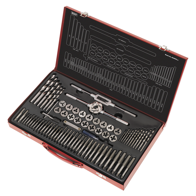 • Contents: Taps and Dies; Coarse - 3 x 0.5, 3.5 x 0.6, 4 x 0.7, 4.5 x 0.75, 5 x 0.8, 6 x 1, 8 x 1.25, 10 x 1.5, 12 x 1.75mm, Fine - 2 x 0.25, 3 x 0.35, 4 x 0.5, 5 x 0.5, 6 x 0.75, 8 x 1, 10 x 1.25, 12 x 1.25mm, Taper and Plug Tap and Die; 1/8"BSP, HSS Drill Bits; 1.7, 2.5, 2.6, 2.9, 3.3, 3.5, 3.8, 4.2, 4.5, 5, 5.3, 6.8, 7, 8.5, 8.8, 10.3, 10.7mm, Tap Wrench, T-Bar Tap Wrench, Die Holder, Thread Gauge, Screwdriver.