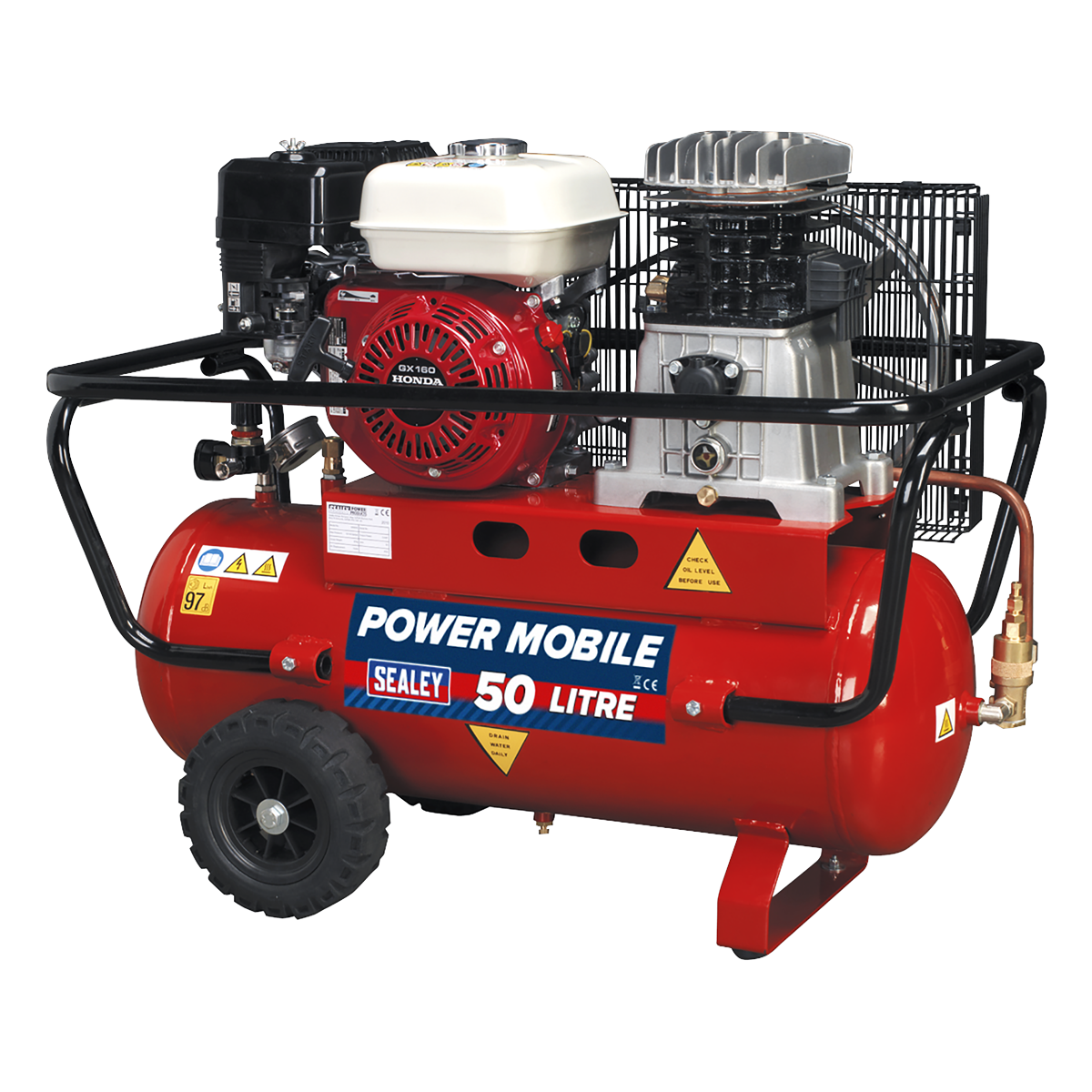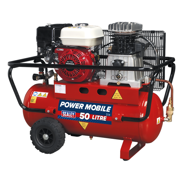 - High-performance 50L belt drive air compressor featuring a powerful 5.5hp Honda GX160 petrol engine for reliable operation.