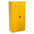 Sturdy metal construction with yellow powder coat. Supplied with a pack of appropriate warning labels. Two door, fitted with 2-point key lock and supplied with two keys. Features three adjustable, lipped shelves and liquid-tight base to retain spills. 155mm Raised, leak-proof door sill.