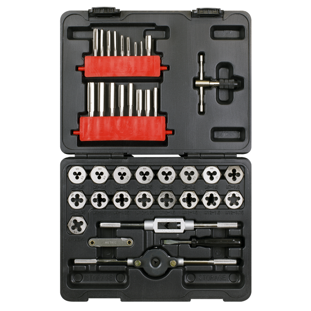 • Contents: Taps and Dies; M3 x 0.5, M3 x 0.6, M4 x 0.7, M4 x 0.75, M5 x 0.8, M5 x 0.9, M6 x 1, M7 x 1, M8 x 1.25, M9 x 1, M9 x 1.25, M10 x 1.25, M10 x 1.5, M11 x 1.5, M12 x 1.5, M12 x 1.75, 1/8”-28BSP, Tap Wrench, T-Handle Tap Wrench, Die Holder, Metric Thread Gauge, Screwdriver.