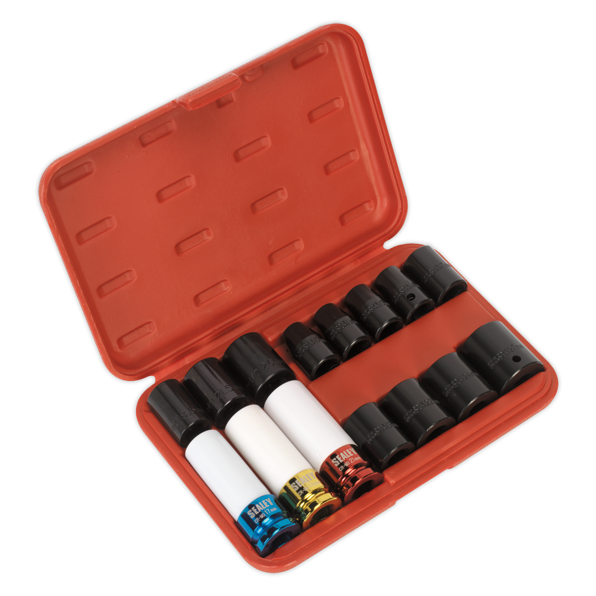 Comprehensive impact socket set. Consists of three Chrome Molybdenum locking wheel nut removal sockets. Three Chrome Molybdenum colour-coded alloy wheel impact sockets with protective sleeve. Nine hardened and tempered Chrome Vanadium steel impact sockets with a phosphate finish for greater corrosion resistance. All impact sockets are WallDrive®, which allows a transfer of up to 30% more torque to the fixing. Supplied in storage case.