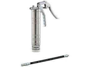 Supplied with a 300mm reinforced flexible hose, 13mm diameter, and a four-jaw coupler, this grease gun ensures a secure connection and consistent grease delivery. The transparent barrel design allows users to easily monitor the grease type and quantity, reducing waste and ensuring optimum use of each cartridge.