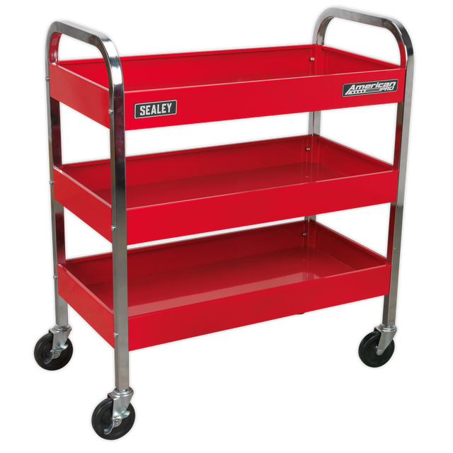 Garage or workshop trolley with a 50kg capacity per shelf. Deep-walled shelves, which may be installed base down or base up to give either tool and component security or unobstructed access. Fitted with four wheels, two fixed and two locking castors.