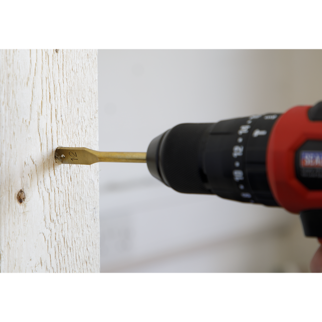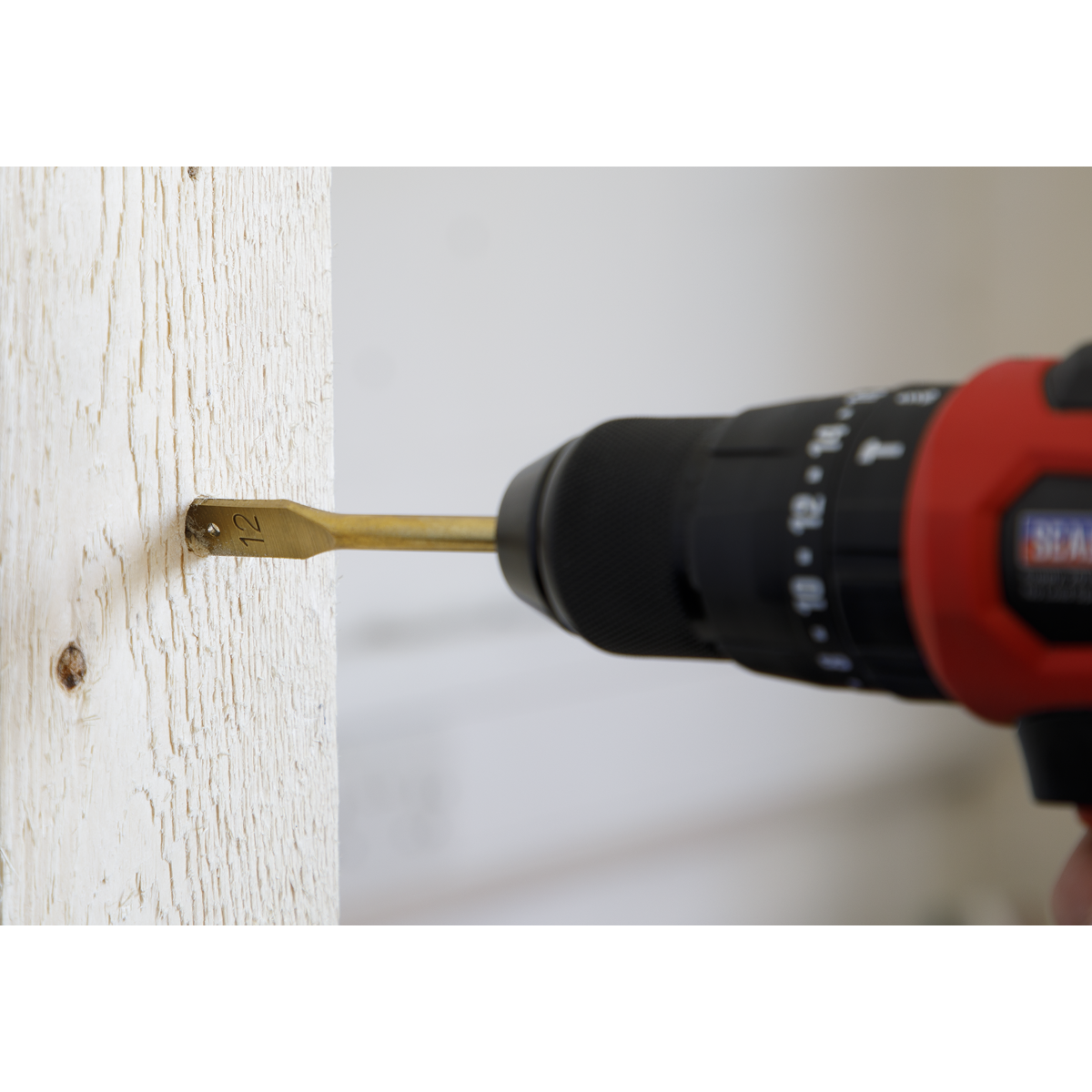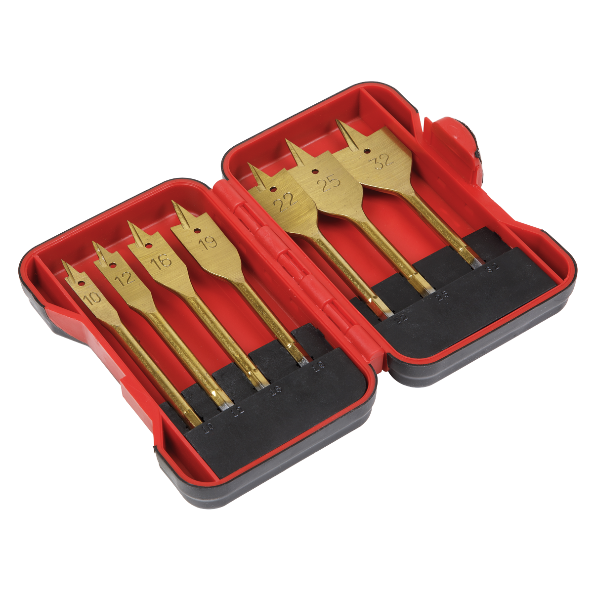 Set consists of seven titanium coated flat wood drill bits. 1/4" Shank allows for a quick change between different drill bits. Popular range of sizes. Supplied in plastic storage box with rubberised, non-slip coating.