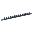 Anodised aluminium socket rail with nylon clips. Can hold up to 14 sockets. Holds up to 14 x 1/2"Sq drive sockets.