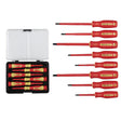 This VDE-approved fully insulated screwdriver set contains eight screwdrivers and six precision screwdrivers. Each is suitable for working on live circuits up to 1,000V AC and 1,500V DC. The blades are manufactured from hardened and tempered S2 steel, and the handles are soft grip for comfort and enhanced torque.