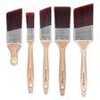 This set of paint brushes from Rollingdog are suitable for use with water-based paints and wood stains and varnish. They feature a premium high-quality synthetic solid round tapered filament that ensures a flawless finish. The durable stainless steel ferrule is resistant to corrosion. The ergonomic handle, made from beechwood, has a laser-engraved pattern for improved grip and control. The hanging hole allows for easy drying and convenient storage. Includes 2" short handle angled brush, 1" and 2" flat brushes, plus 1.5" and 2.5" angled brushes.