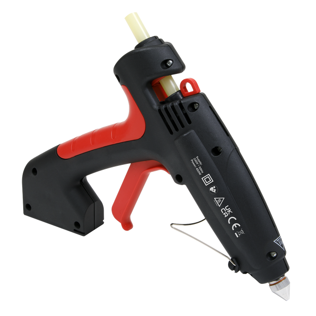 Ready to use in less than five minutes. Once fully heated, mains cable can be unplugged from body for short periods of cordless use. Composite housing with soft grip for added comfort. On/off switch and trigger feed control. Suitable for Ø11 x 100mm glue sticks. Two glue sticks can be loaded at once. Features magnets in handle base for adhering to metal stand when not in use.
