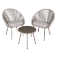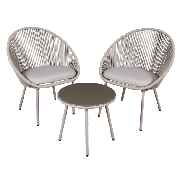 Frame constructed from powder coated steel. Contemporary design with Ø8mm round weather-resistant Textilene® rope. Powder coated steel table with 5mm shatterproof tempered glass top. Supplied with 5cm thick seat cushions. Set includes two chairs and tempered glass top table. Some simple assembly is required.