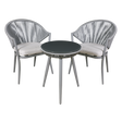 Frame constructed of powder coated rustproof aluminium. Aluminium tripod table with 5mm shatterproof tempered glass top. Contemporary design with Ø8mm round weatherproof Textilene® rope. Supplied with 5cm thick seat cushions. Set includes two chairs and tempered glass top table. Some simple assembly is required. Disclaimer: Colours may slightly vary due to lighting conditions.