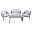 - Complete 4-piece set includes a 2-seater sofa, 2 armchairs, and a stylish aluminium coffee table for versatile outdoor lounging.