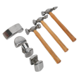 Polished, drop-forged steel dollies. Professional hickory handled hammers. Supplied in storage case.