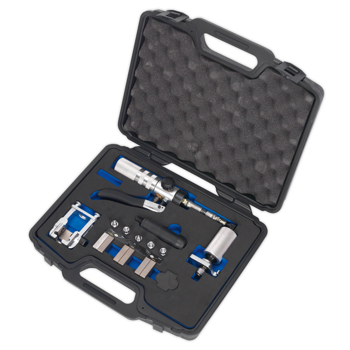 Produces accurate automotive SAE and DIN flares on Ø3/16", 4.75mm, 5mm and 6mm brake pipes. Ideal for splicing in replacement sections of brake pipe. Powerful, lever operated hydraulic ram makes it suitable for steel pipes. Features quick release chuck, twist lock die block housing for fast assembly and rotating hydraulic pipework to give easy-access in confined spaces.