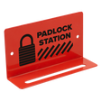 Padlock station designed for storage and display of up to six safety lockout padlocks. Red powder coated finish for easy identification of hazards. Size (W x D x H): 140 x 40 x 80mm.