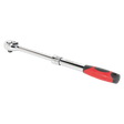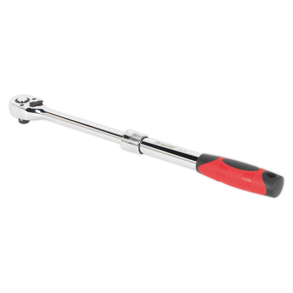 Ratchet wrench with forged Chrome Vanadium steel inner and outer shaft, heat treated and chrome plated with a fully polished mirror finish. Quick release locking ring retains extension at set increments, giving six different shaft lengths. Soft grip handle for added comfort and control. Pear head design with flip reverse mechanism and spring loaded socket retaining ball.