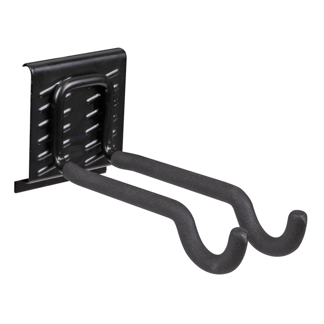Steel sports equipment storage hook. Powder coated to prevent oxidisation. PVC Wrapped to avoid damage to tools and equipment. Designed to be used in conjunction with Wall Mountable Storage Rail Model No. APH01 for quick and easy installation and repositioning. Ideal for sporting equipment and long handle tools. Overall maximum load of 20kg. Dimensions (W x D x H) 76 x 200 x 90mm.