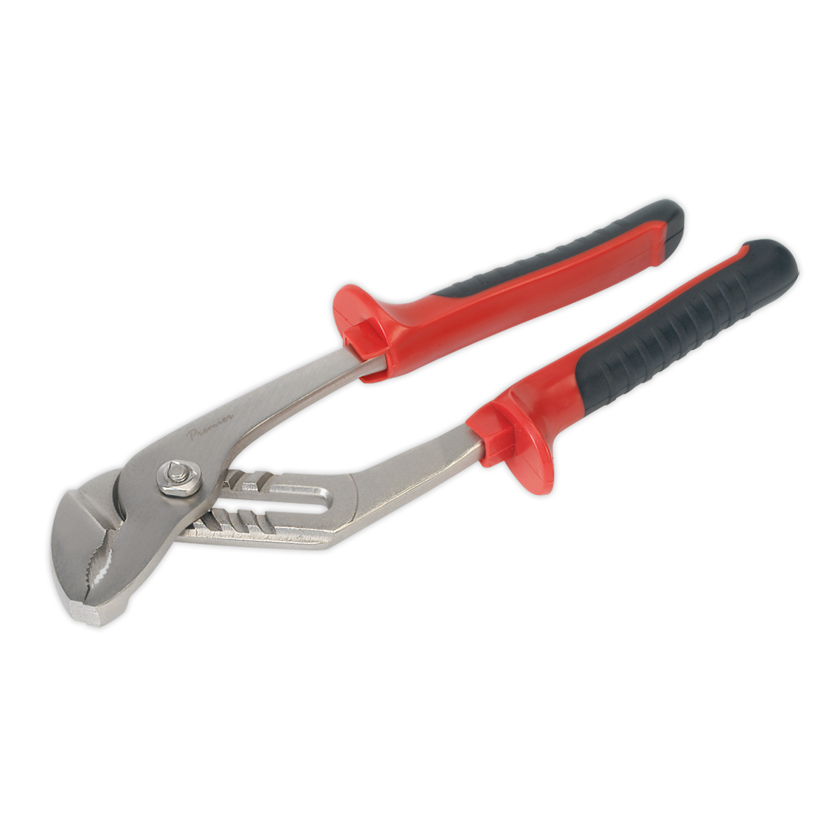 Drop-forged Chrome Vanadium steel water pump pliers with Ti-Chrome finish for improved durability. Groove joint adjustable head. Dual material handles with anti-slip guard for comfort and control.