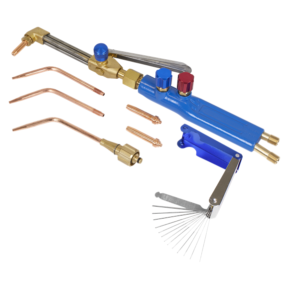 Supplied with AFNM nozzle sizes: 1/16", 3/64" and 1/32" suitable for cutting up to 75mm plate. Welding torch dual controls allow for separate control over oxygen and acetylene flow creating different flames. Supplied with No's 2, 5 and 10 lightweight welding nozzles. Cleaning tool is designed for cleaning cutting nozzles. High quality lightweight copper cutting and welding nozzles.