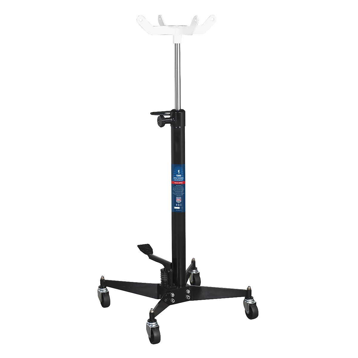 This transmission jack features Quick Lift to reduce the time and effort needed to get saddle to gearbox. Single foot pedal operation keeps hands-free during lifting process. Spring loaded dead man's safety release control reduces the risk of inadvertent lowering. 2-Way hydraulic unit ensures that the saddle lowers at a controlled speed at all times, even without load. Saddle is reversible allowing a jack pad to be fitted to support items other than transmissions. Castors and side handle make the unit easily manoeuvrable. Hydraulic unit larger than the economy models for improved performance and durability. Can be fitted with optional Adjustable Gearbox Support - Model No. ADT5.