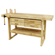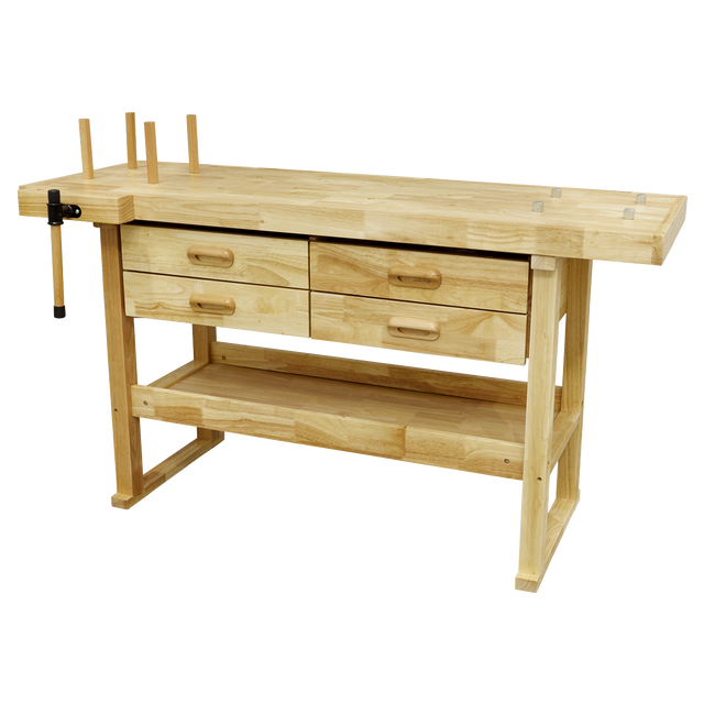 Made from Rubberwood. Features tool well, shelf, four tool drawers, front vice, four metal bench stops and four wooden board jacks. Supplied with four wooden pegs and four anvil pegs.
