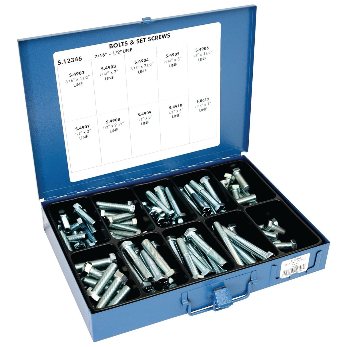 Contains: 10 x S.8613 Imperial Setscrew, Size: 7/16'' x 1'' UNF (Din 933) Tensile strength: 8.8. 10 x S.4902 Imperial Setscrew, Size: 7/16'' x 1 1/2'' UNF (Din 933) Tensile strength: 8.8. 10 x S.4903 Imperial Setscrew, Size: 7/16'' x 2'' UNF (Din 933) Tensile strength: 8.8. 10 x S.4904 Imperial Bolt, Size: 7/16'' x 2 1/2'' UNF (Din 931) Tensile strength: 8.8. 10 x S.4905 Imperial Bolt, Size: 7/16'' x 3'' UNF (Din 931) Tensile strength: 8.8. 10 x S.4906 Imperial Setscrew, Size: 1/2'' x 1 1/2'' UNF (Din 933) Tensile strength: 8.8. 10 x S.4907 Imperial Setscrew, Size: 1/2'' x 2'' UNF (Din 933) Tensile strength: 8.8. 10 x S.4908 Imperial Bolt, Size: 1/2'' x 2 1/2'' UNF (Din 931) Tensile strength: 8.8. 10 x S.4909 Imperial Bolt, Size: 1/2'' x 3'' UNF (Din 931) Tensile strength: 8.8. 5 x S.4910 Imperial Bolt, Size: 1/2'' x 4'' UNF (Din 931) Tensile strength: 8.8.