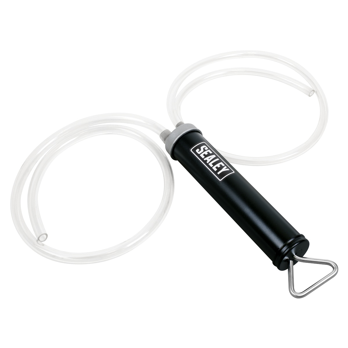Draws in and pumps out liquid in a single stroke. Easy and safe answer to fluid transfer, especially useful in transferring media unsafe for body contact. Rugged aluminium die-cast head. Steel barrel in premium powder coated finish with heavy-duty rubber plunger. Supplied with 2.4m of vinyl hose, 1.2m on each valve.