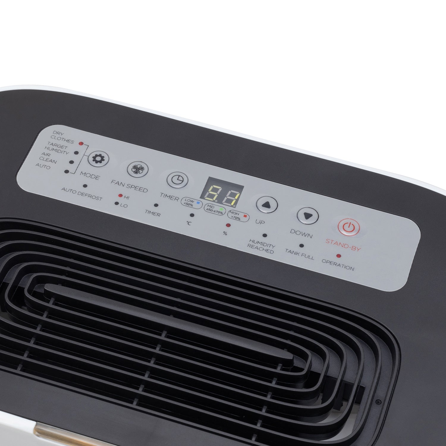 Eco-conscious performance is ensured with an R290 refrigerant system and automatic shut-off when the tank reaches capacity. The unit is easily moved with robust castors and includes an electronic touchpad control for intuitive use in compact residential or commercial settings.