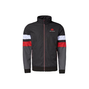 Made from high-quality materials, the jacket features a stylish black and dark grey base with contrasting white, black, and red sleeve patches. Elasticated sleeve cuffs provide a secure fit and enhance overall comfort, ensuring freedom of movement throughout the day.