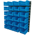 Comprises 24 plastic storage bins - sized: 102 x 160 x 75mm that fix to a heavy duty plastic mounting board size 483 x 540mm. Ideal for industrial environments i.e. garages and workshops. Display carton.