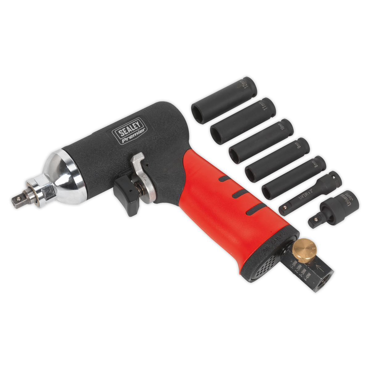 Reduced torque impact wrench suitable for the removal of seized glow plugs on diesel engines. Features a 4-position air regulator which provides limited torque settings to suit. One-handed operation for trigger and forward/reverse control. Soft grip reduces vibration, chill effect and adds comfort. Handle exhaust helps to lower noise level during use. Includes five deep impact sockets, extension bar and universal joint. Supplied with foam insert and metal storage case.