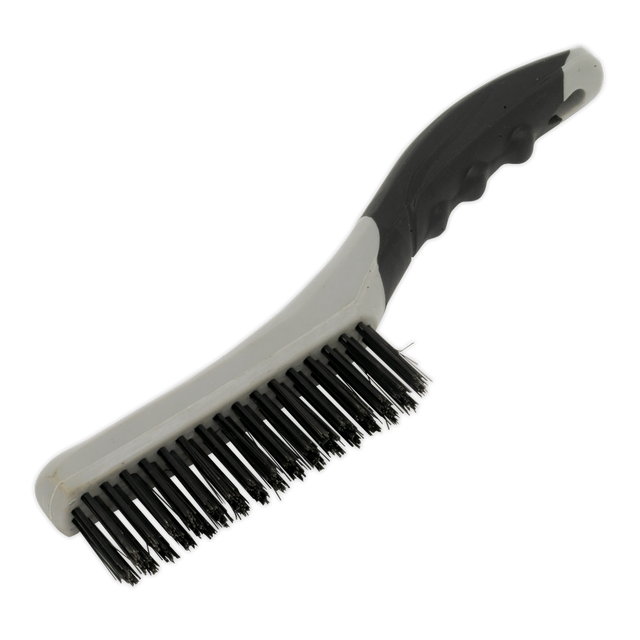 Composite stocked brush with a contoured soft grip handle and hanging hole. Black high carbon steel filled head suitable for general-purpose applications.