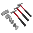 Polished, drop-forged steel dollies. Hammers with fibreglass handle and rubber grips. Supplied in storage case.