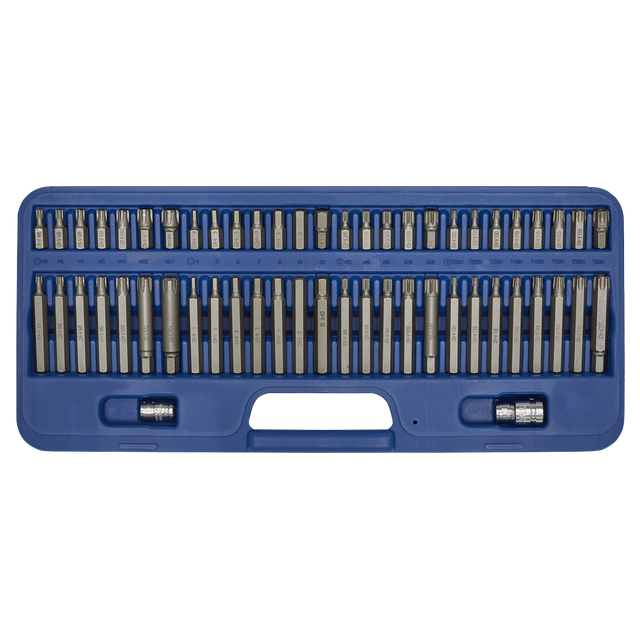 Chrome Vanadium 6150 steel bits, each size in 30 and 75mm lengths. Set includes 3/8" and 1/2"Sq drive to 10mm hex Chrome Vanadium steel adaptors. Supplied in storage case with inclined trays for quick and easy bit selection.