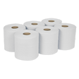 Pack of six white embossed paper, centre-feed, 2-ply, perforated roll wipes.